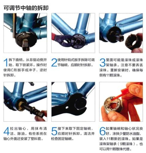 如果中軸狀況良好,潤滑后可以重新安裝使用。不過安裝后需要調節。裝入可調節軸碗,感覺到有點阻力即可。此時軸心應該沒有曠量。如果必須繼續上緊可調節軸碗才能消除曠量,就應該更換整個中軸系統了。如果沒有問題,安裝鎖緊環,固定可調節,軸碗不動,上緊鎖緊環。檢查軸心是否能順暢轉動,然后重新安裝曲柄。調節過程可能需要重復幾次。