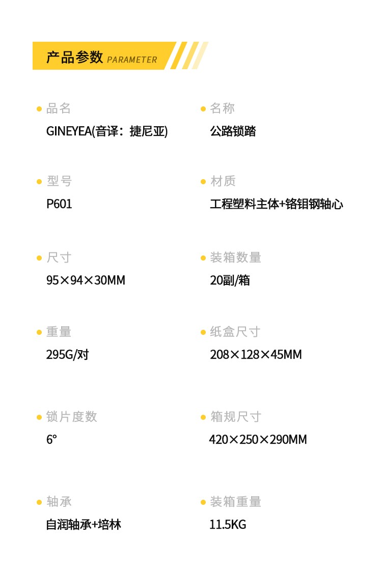 產(chǎn)品描述:請注意,本店標價都是不包括稅點,開票另加稅點,詳細請咨詢客服!!!品牌:GINEYEA(捷尼亞) 型號:P601 品號:13010014 品名:公路車鎖踏PRO(附鎖片6°)黑色執(zhí)行標準:ISO4210 工藝:本體及扣片注塑成型材質(zhì):本體及扣片為工程塑料 軸心為鉻鉬鋼 顏色: 黑色/紅色/淺藍/橙色#公路車專業(yè)自鎖鎖踏,適用SPD-SL系統(tǒng),自帶鎖片體驗不一樣的騎行速度、穩(wěn)定、省力,踏板流線型一體化設計,高強度質(zhì)量輕的尼龍材料...